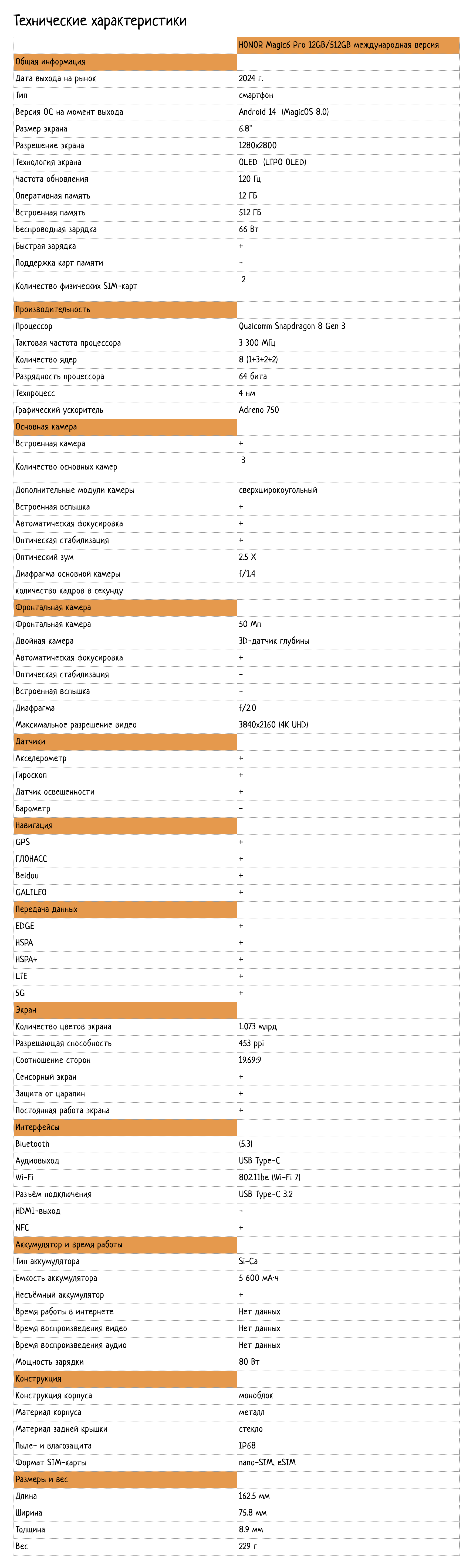 HONOR Magic6 Pro 12GB/512GB - смартфон представляющий международную версию с высокими техническими характеристиками. Сочетание Android, 6.8" OLED экрана с частотой обновления 120 Гц, процессора Qualcomm Snapdragon 8 Gen 3, 12 ГБ оперативной памяти и 512 ГБ встроенной памяти делает его весьма привлекательным для тех, кто ценит производительность и качество изображения.