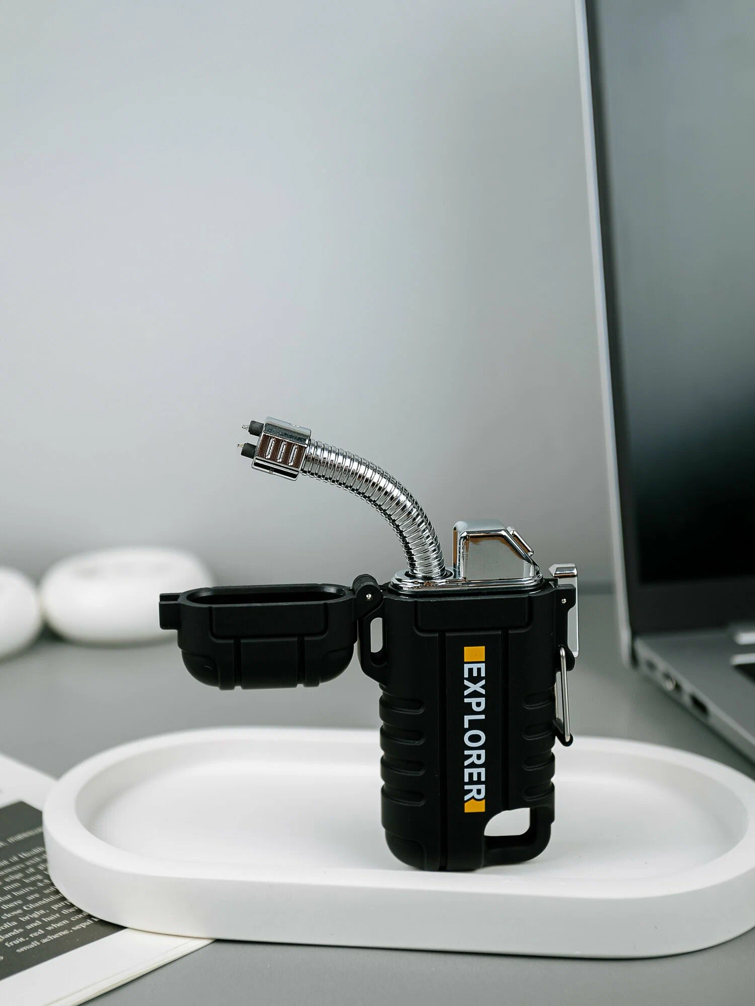Корпус сделан из сплава цинка с прорезиненным покрытием, за счёт чего не боится воды и удобно лежит в руке. Поджигает даже при ветре — классическая огненная зажигалка так не сможет.