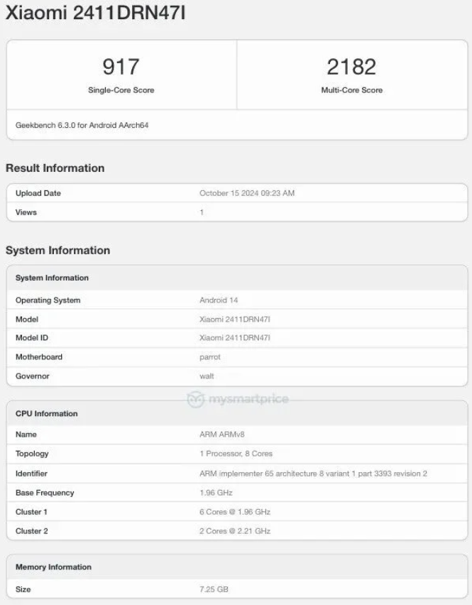 Информация из списка Geekbench подтверждает, что устройство работает на базе чипсета Snapdragon 4 Gen 2, выполненного по 4-нм техпроцессу для повышения энергоэффективности. Процессор состоит из шести экономичных ядер с частотой 1,96 ГГц и двух высокопроизводительных ядер с частотой 2,21 ГГц. В конфигурации смартфона также указаны 8 ГБ оперативной памяти и операционная система Android 14.