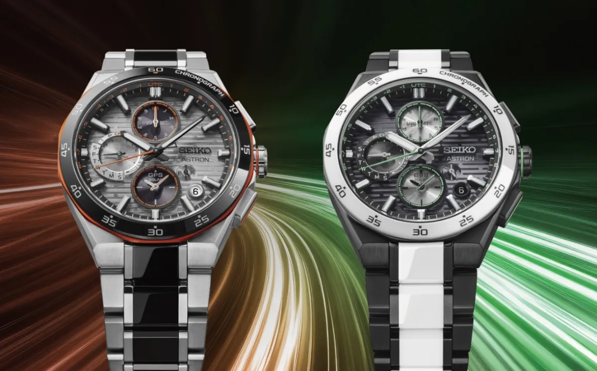 Seiko продолжает экспериментировать с дизайном в коллекции Astron. Вдохновлённые «скоростью света», новые SSH183J1 и SSH185J1 получили горизонтальный узор на циферблате и яркие цветовые акценты. Первая версия выполнена в серебристо-чёрной гамме с неоново-оранжевыми деталями, вторая — в чёрно-белом оформлении с зелёными вставками. Титан и керамика в корпусе и браслете обеспечивают лёгкость и прочность, а также устойчивость к износу.